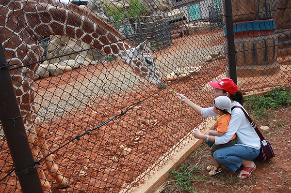 再走到長頸鹿區圍籬外,摘了旁邊的牧草,兩隻長頸鹿立刻走向前