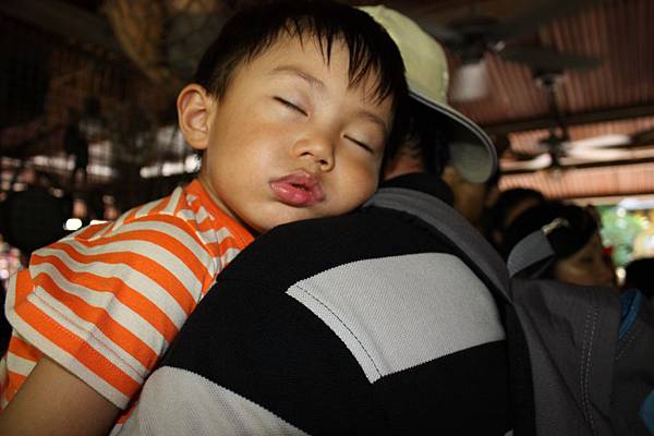 這時小子的眼皮已經越來越沉重,天氣實在太熱了,因此ㄧ到有冷氣的地方,就會忍不住睡著,可是老媽我們已經決定今天要把小子操個夠,於是繼續扛著他,朝"探險世界"前進~~