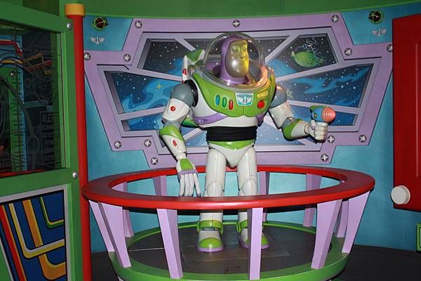 時間到囉~我們趕去巴斯光年那關,在排隊的同時,可以欣賞到這尊維妙維肖的人物,除了身體四肢靈活轉動,厲害的是,他的臉部表情會隨著說話而有不同變化,簡直比機器人還逼真啊~~這關是拿槍不停的射Z,最後看你的得分~~麻麻第一次射就二十萬分呢!!等級四而已~~~
