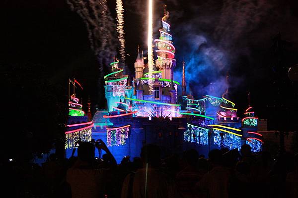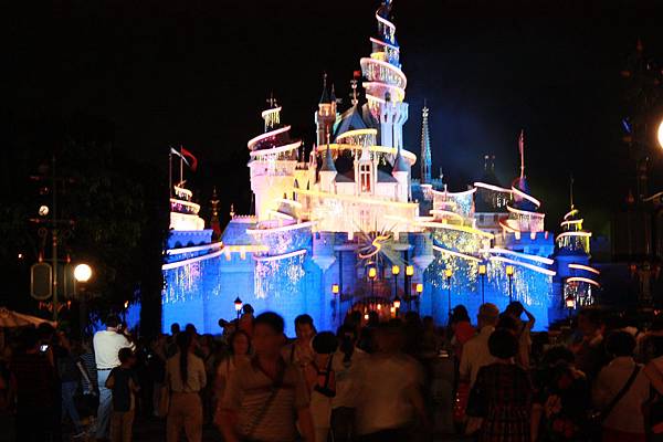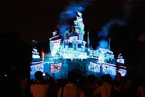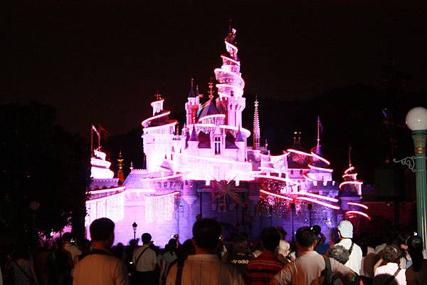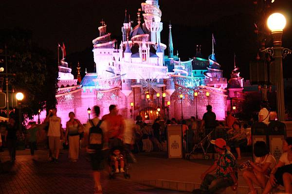 夜間的城堡在五彩燈光下更顯的光采奪目~~大家席地而坐,準備看八點半的奇妙仙子城堡點燈~~