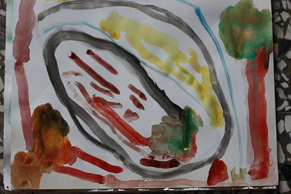 前面幾張都是色彩的摸索期和塗鴉的練習,連他自己也不知道在畫什麼?大概只有上帝才會知道吧!!沒想到今天畫出個我們看的懂的東西出來,他自己也覺得非常開心,一畫就是一個鐘頭,現在每天幾乎都又來個幾筆,麻麻可能要趕快再準備補充品了~~