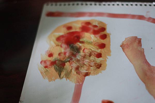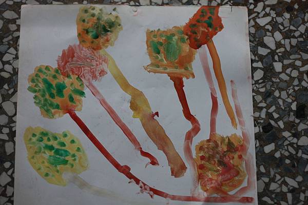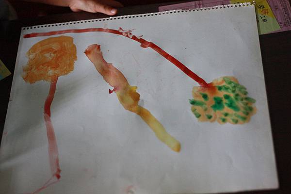 第一張畫好了,右邊可以看出是一棵樹木~本來他整棵都是咖啡色,我問他樹上面有沒有葉子啊?他自己就用綠色來覆蓋上去~~