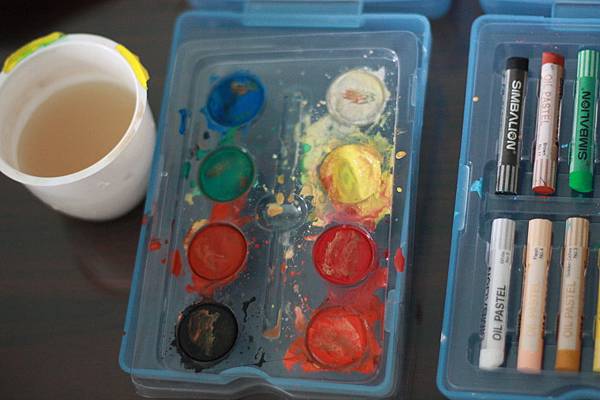 後來想到了這種"粉餅式"的水彩,只要沾水,就可以使用,也不需調色盤,對於第一次玩水彩的小子而言,應該是很容易上手,重點是~~老媽我應該也容易收拾散後~~