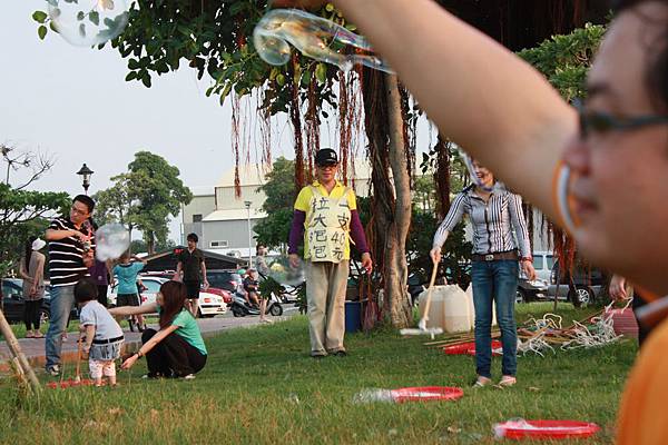只要準備幾支做好的大泡泡架和泡泡水,就可以做生意了~~整個公園飛滿大泡泡,小孩到處追著拍打泡泡,笑聲不絕於耳啊~~
