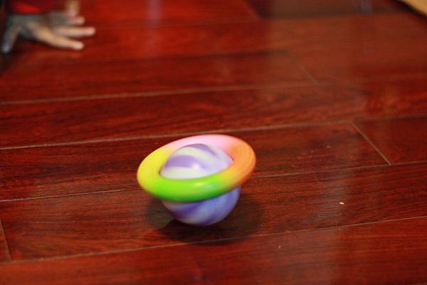 隨便拿個球和套環,兜在一起,再用點力扭轉,就變成我自創的新式陀螺了~~讚不讚?