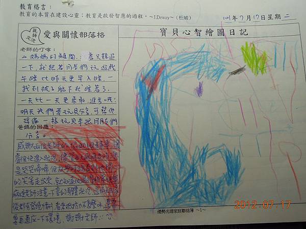 老師都說他適應的很好,也很講理,意思是老師跟他說,等什麼時候麻麻一定來接你...小子就會安靜下來,並參與同學的活動~~