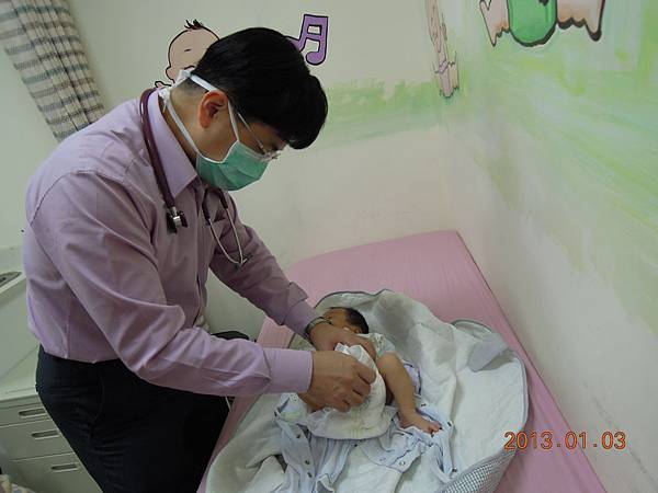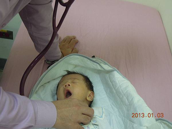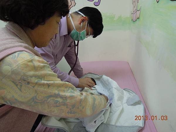 在量完身高體重後,由小兒科醫師做檢查~~醫師正在仔細聽kiwi的心臟~~